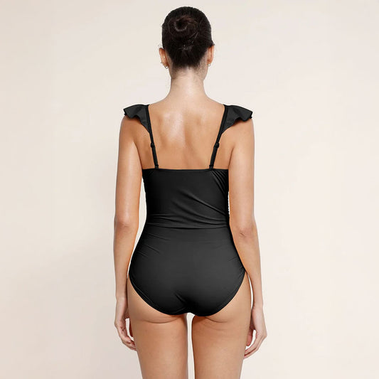 Black Shaping One-Piece Swimsuit with V-Neckline and Ruffles