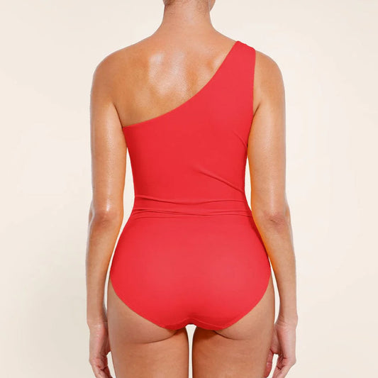 One Shoulder One Piece Ruched Swimwear with Support (Red)